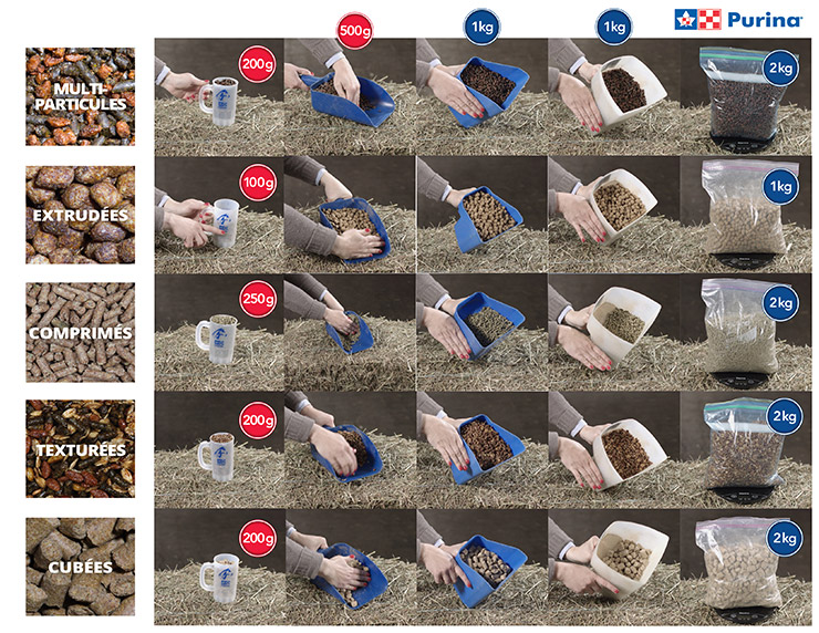 La quantité de nutriments nécessaire au maintien d'une bonne condition de chair et d'une bonne forme physique peut varier d'un cheval à l'autre. En cas d'incertitude, il est recommandé de commencer l'alimentation à un taux plus bas qu'élevé, pour graduellement augmenter le niveau au besoin. Si nécessaire, assurez-vous d'ajouter le produit hybride Equilibrium Equilizer ou Equilibrium Optimal afin de bien équilibrer l'apport en vitamines et en minéraux. Demandez l'aide du consultant équin Purina de votre région !